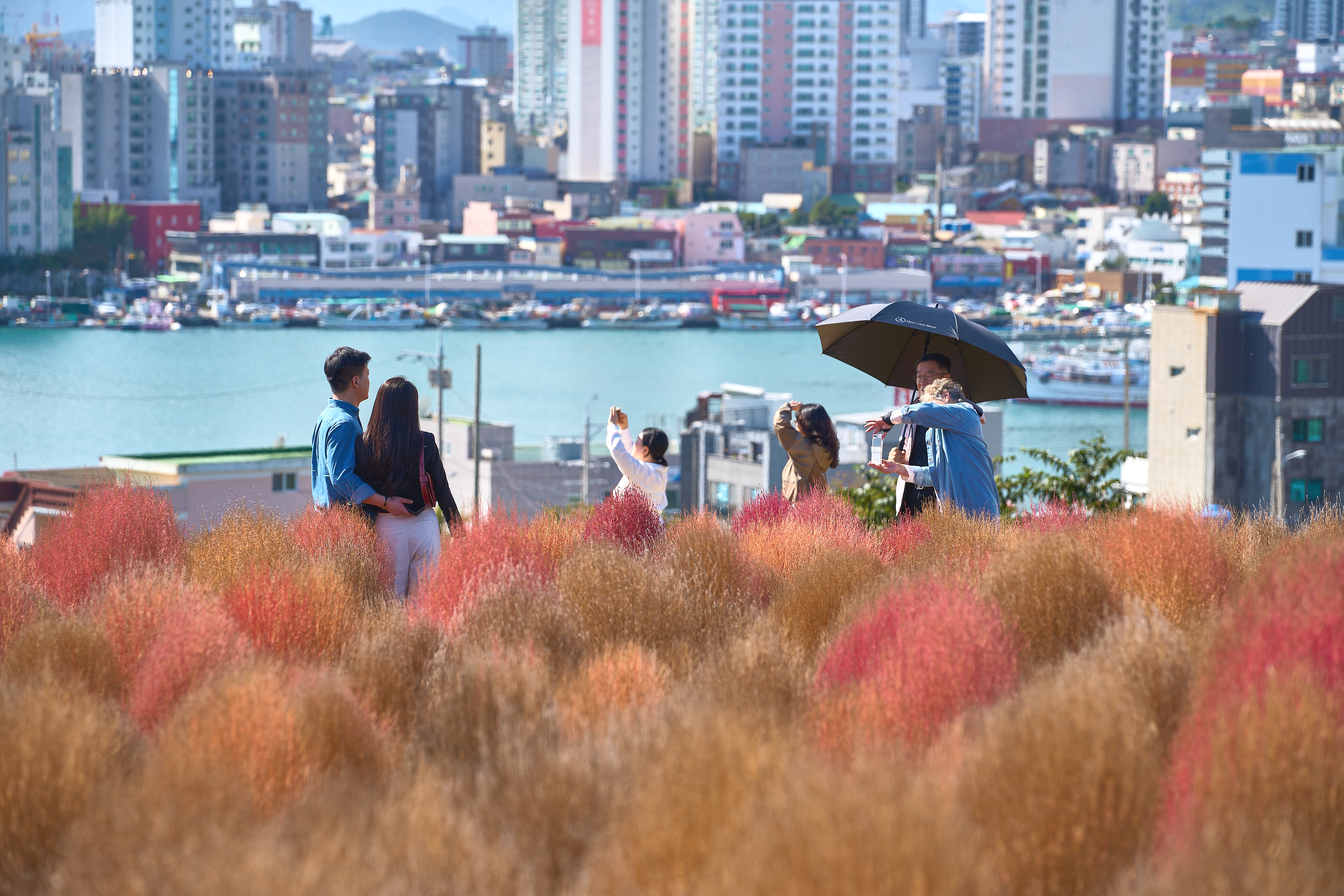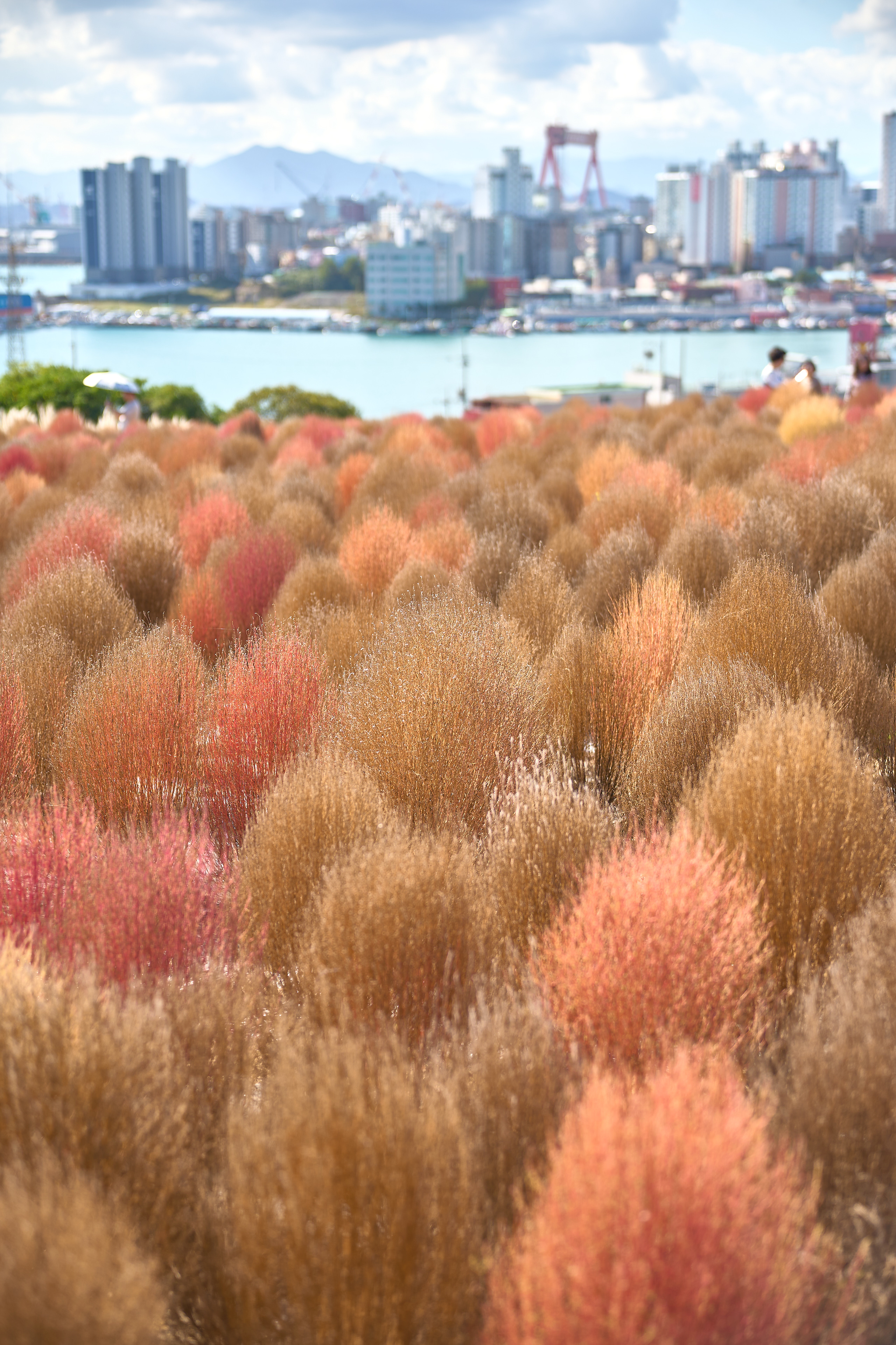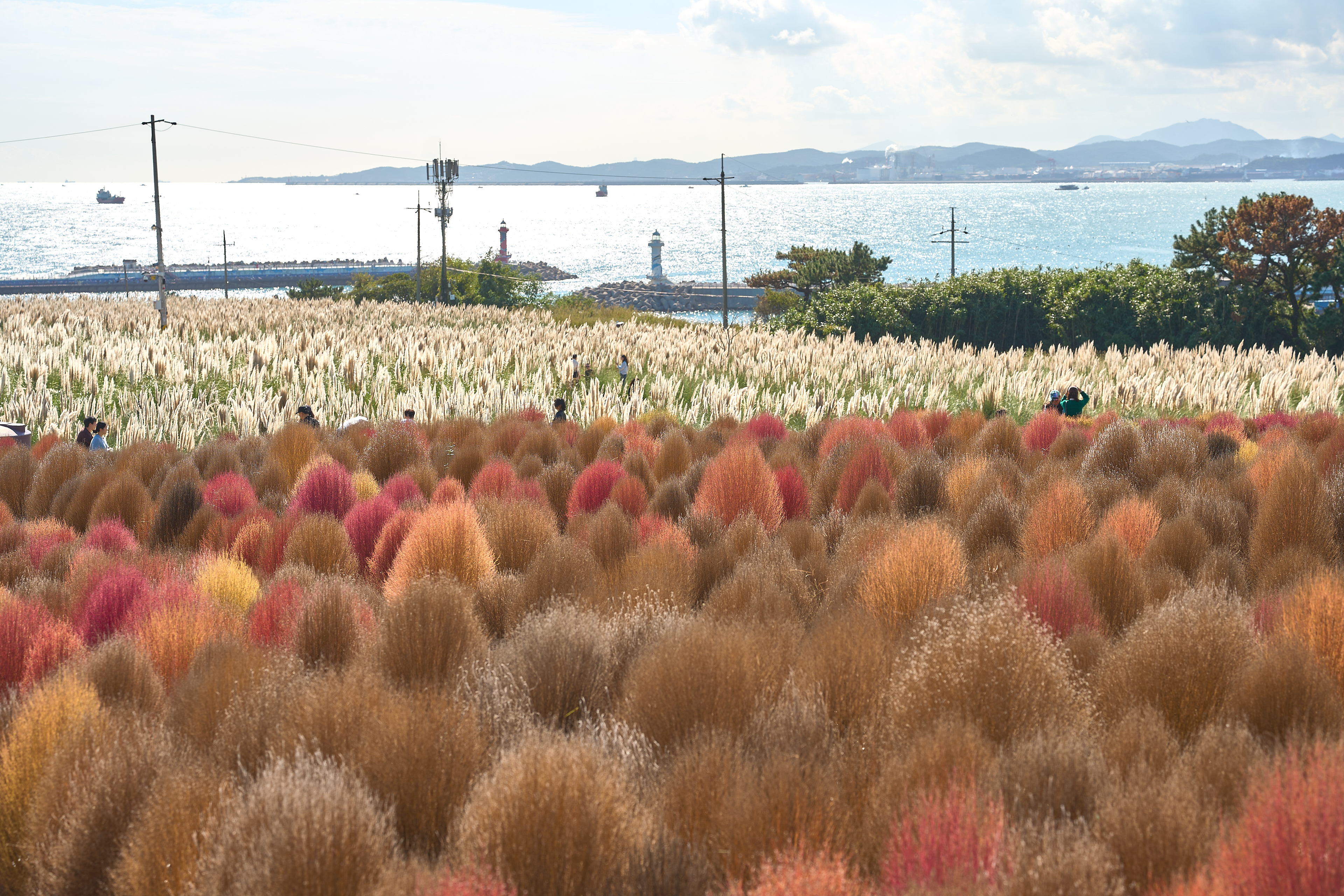 붉게 물든 댑싸리와 키 높은 팜파스가 바다 배경과 어우러져 마치 그림 같은 풍경을 선사합니다.