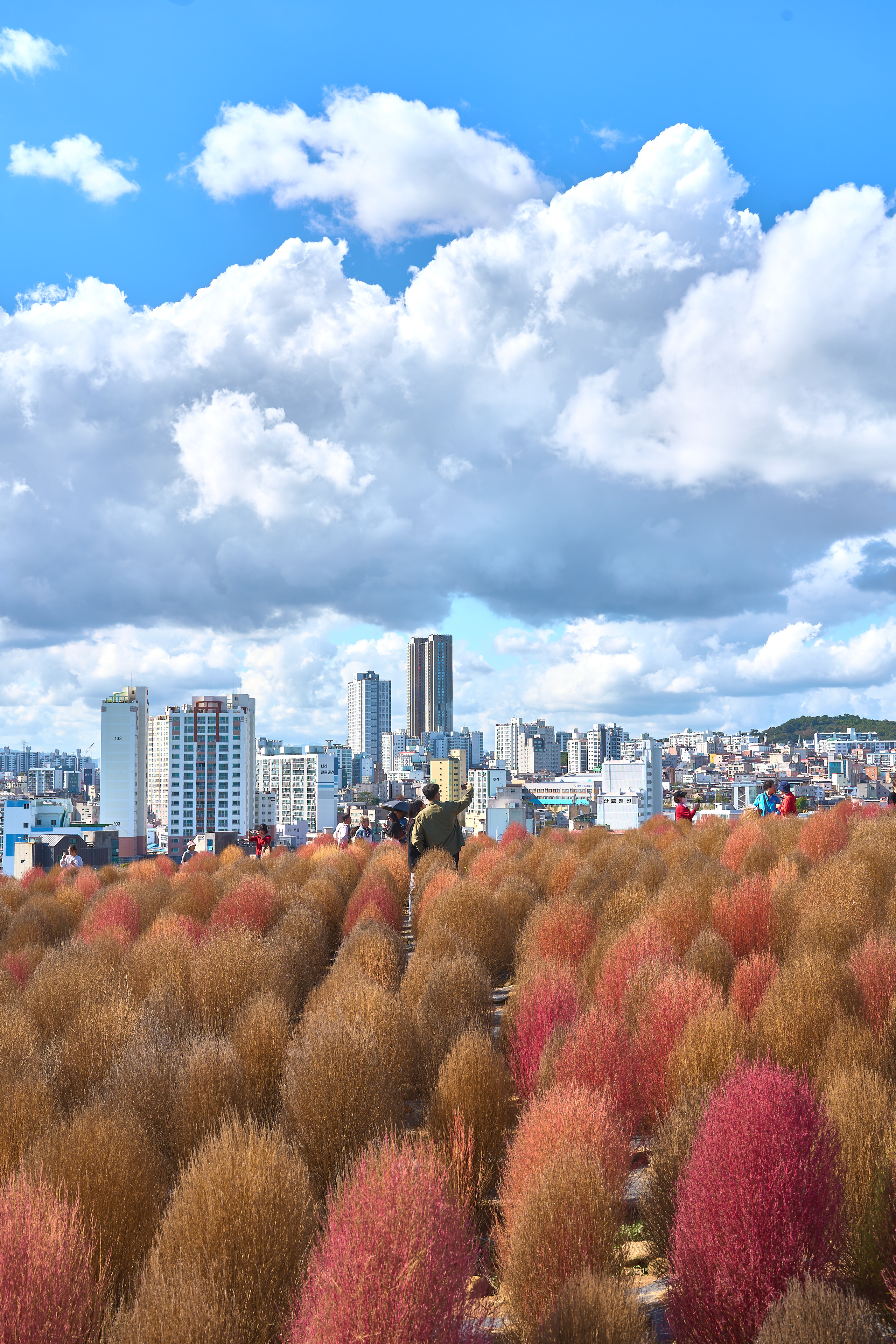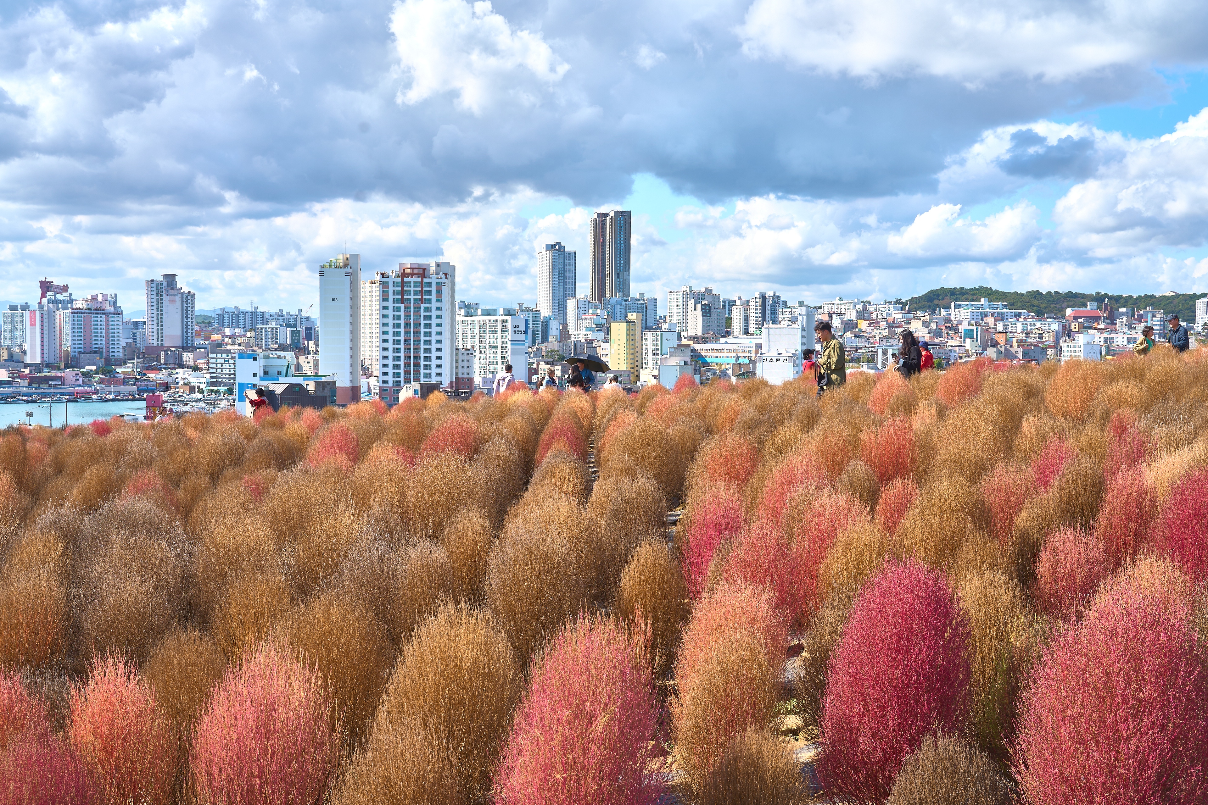 울산 동구 슬도는 바다 옆 언덕에 자리한 초화단지로, 가을이면 붉게 물든 댑싸리와